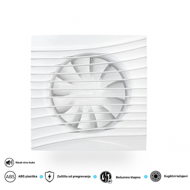 Motor sa kugličnim ležajem ne zahteva dodatno održavanje i omogućava ugradnju ventilatora u vertikalni i horizontalni položaj (sa uklonjenim nepovratnim ventilom). Napravljen od izdržljive ABS plastike. Instalacija se vrši pomoću vijaka za samoprezivanje, koji su uključeni u komplet.