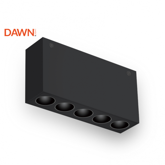 Nadgradna LED svetiljka crne boje. Poseduje pet spot svetiljki koje emituju toplo belu svetlost ukupne snage 13w.