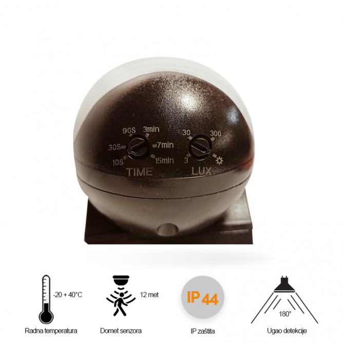 - Prepoznaje dan i noć: možete podesiti rad senzora prema različitim ambijentalnim svetlosnim uslovima. Radi i danju i noću kad je podešen na poziciju „sunce” (max). Radi i u uslovima kada je ambijentalna svetlost manja od 3 luksa ako je podešen na poziciju „3” (min). Za podešavanje pogledajte šablon testiranja.